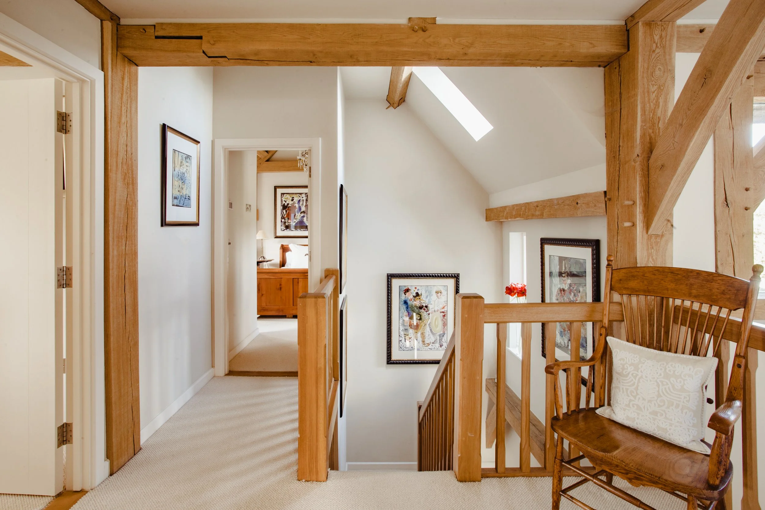 The main living room is a beautiful oak framed barn room, top-lit by ridge glazing.