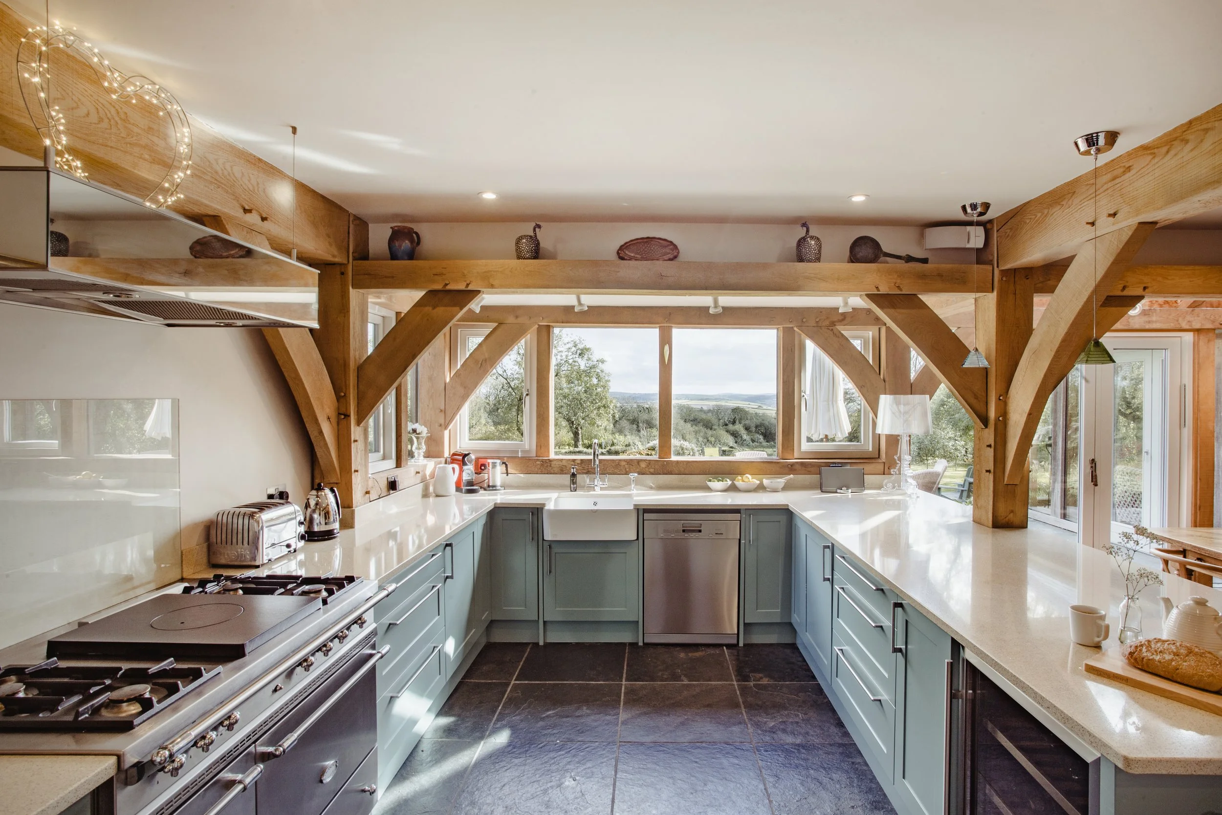 The open-plan kitchen and dining area is at the heart of the house and enjoys full-height glazed oak walls facing the beautiful garden views down to the lake.