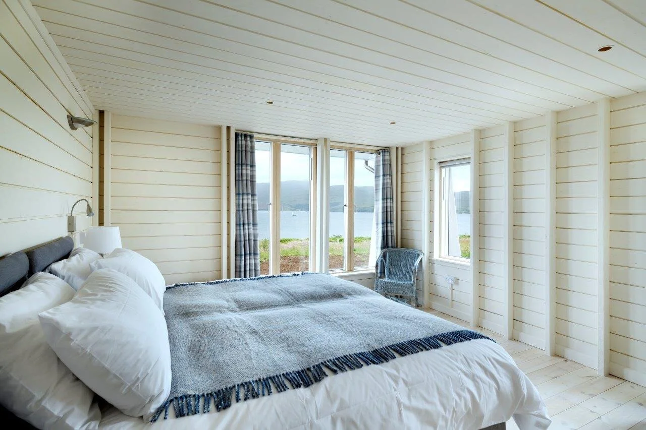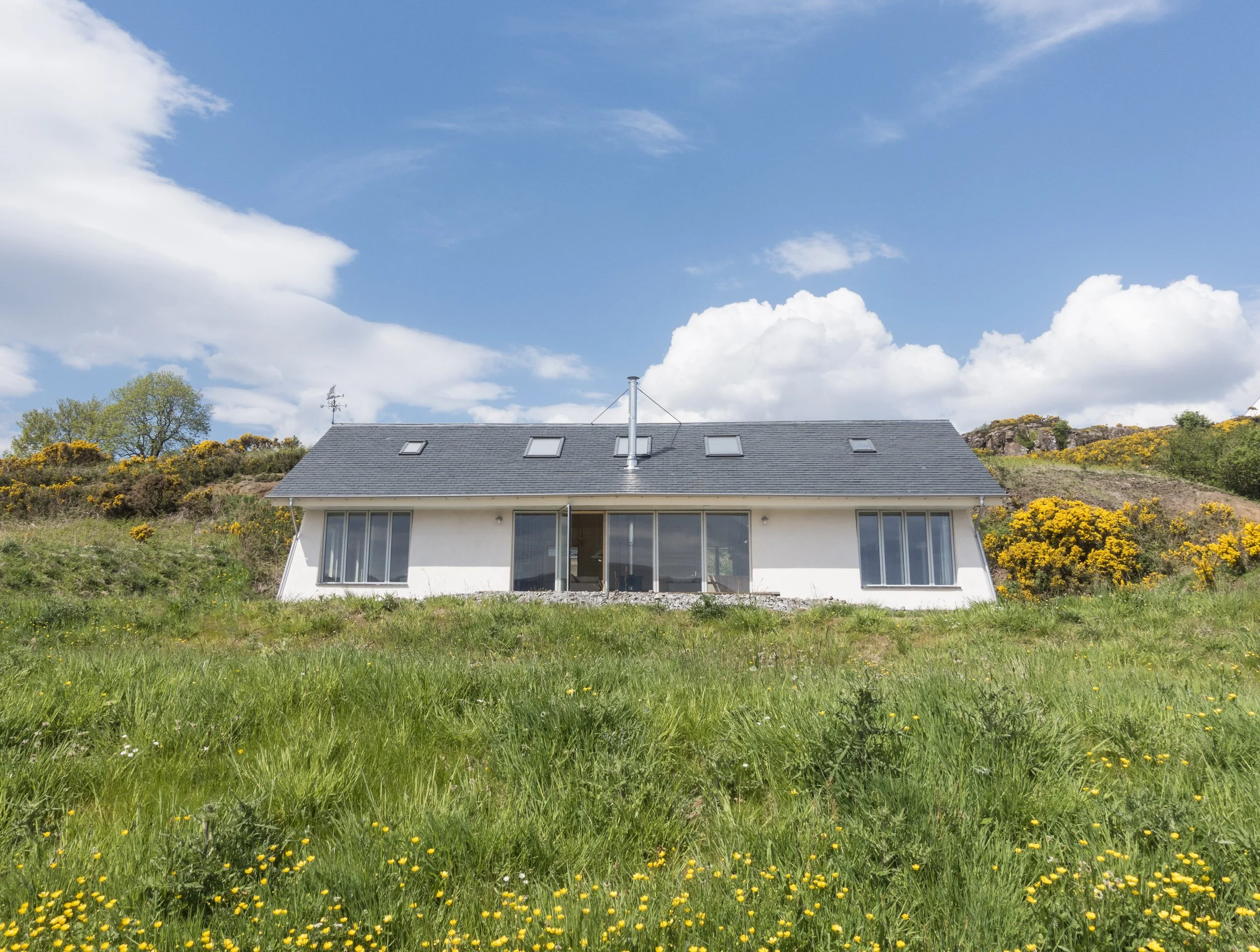 The single storey, detached, timber-framed home overlooks the Sound of Mull on the west coast of Scotland and features unusual white-rendered tapering walls, under a grey slate roof.
