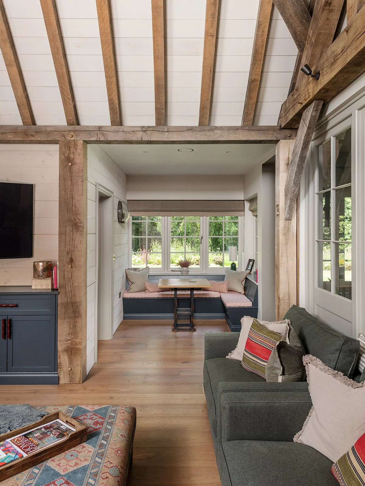 Well considered fixtures and fittings give the interior a traditional yet timeless feel, with green oak structural framing providing drama and texture within rooms with vaulted ceilings.