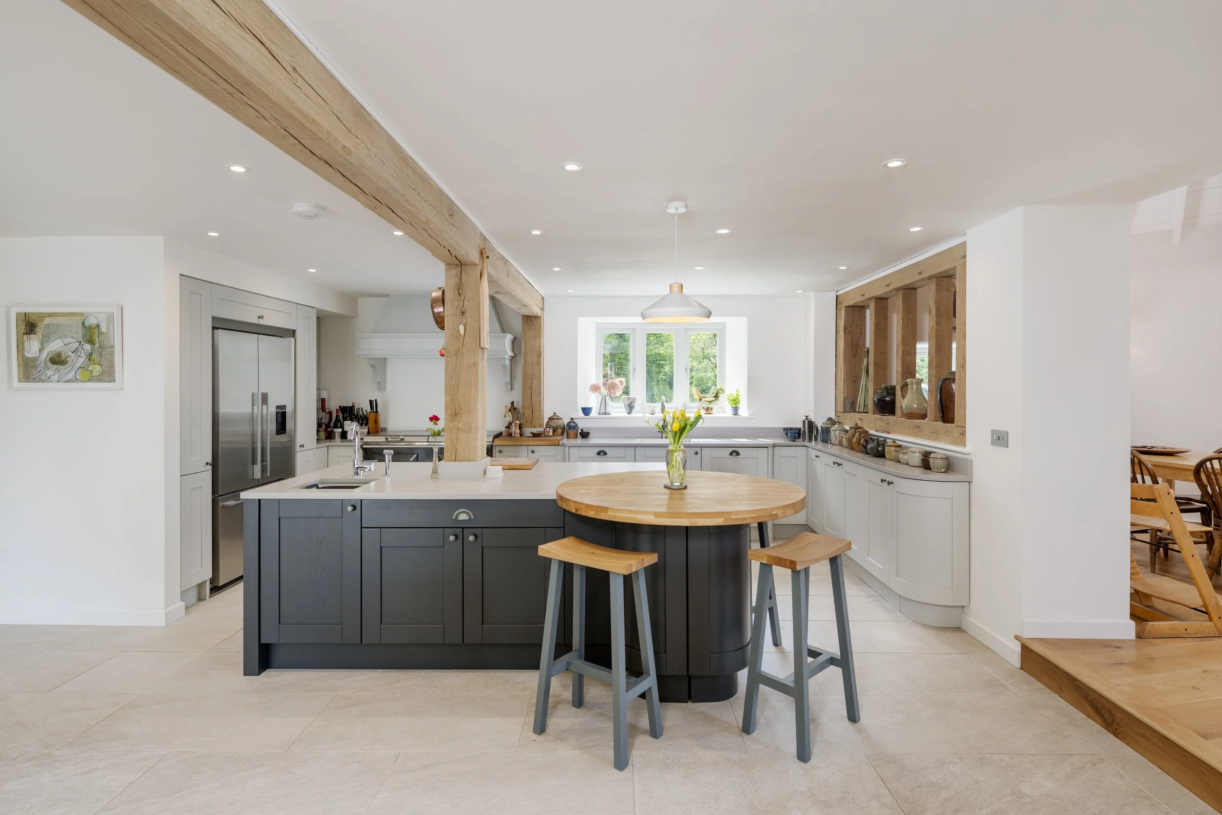 Elsewhere on the project, the original structure was repaired and new internal features inserted, such as this oak screen between the kitchen and dining room, to create a harmony with the new oak elements.